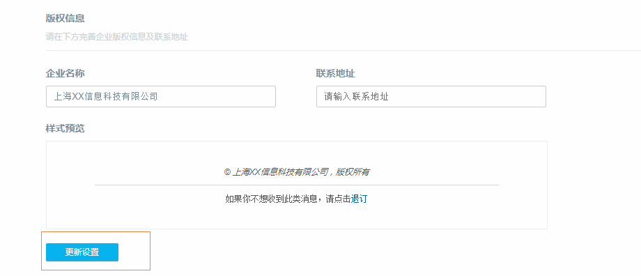 已认证的账号,系统会自动添加您的版权信息,企业名称为您认证时填写的那个公司名称,如果您不想显示公司名称或者需要更改显示的名称和地址,填好内容后,点击更新设置就好了。